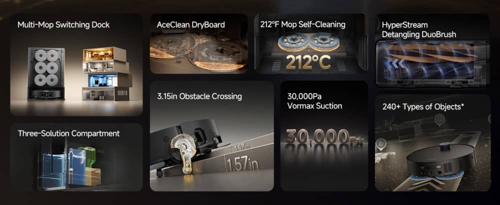 | Dock Automation | Full auto (dust, mop wash & dry, water refill) | Dust empty, mop wash/dry | Dust empty, mop wash/dry, water refill & sanitize |